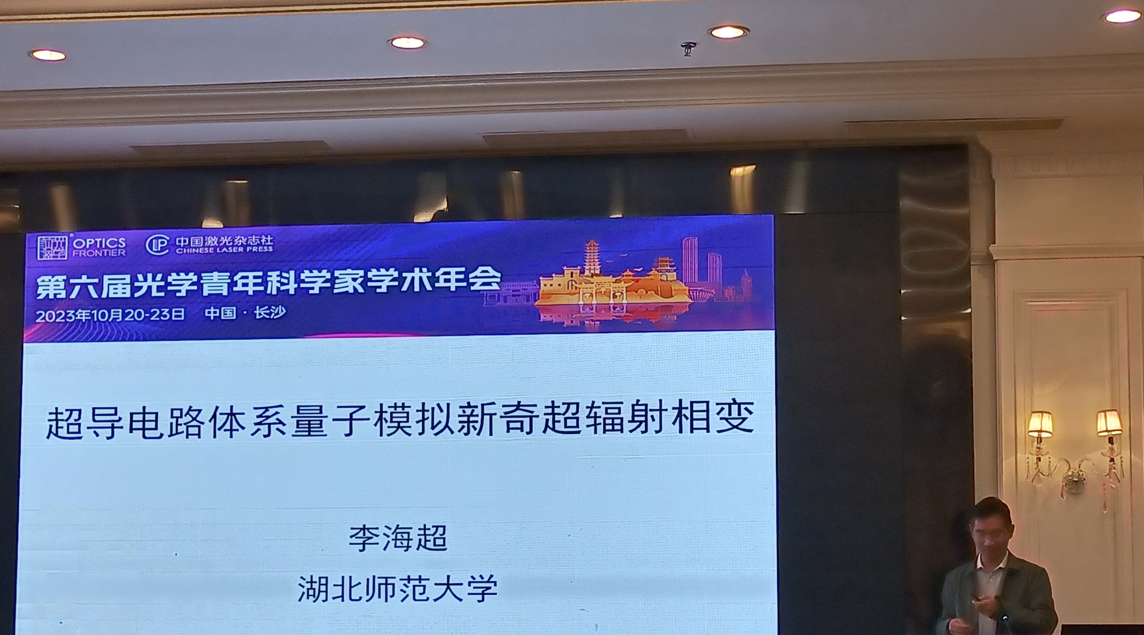 2023年10月23日,我院李海超博士应邀在第六届光学青年科学家学术年会上作报告,报告题目为《超导电路体系量子模拟新奇超辐射相变》。李海超博士介绍了团队在多体量子相变和超导量子模拟领域的最新进展,展示了新奇的四重简并的全域超辐射相变,探讨了其在超导量子电路体系的实验可行性。报告吸引了与会学者的浓厚兴趣,就相关问题在提问环节开展了热烈的讨论。