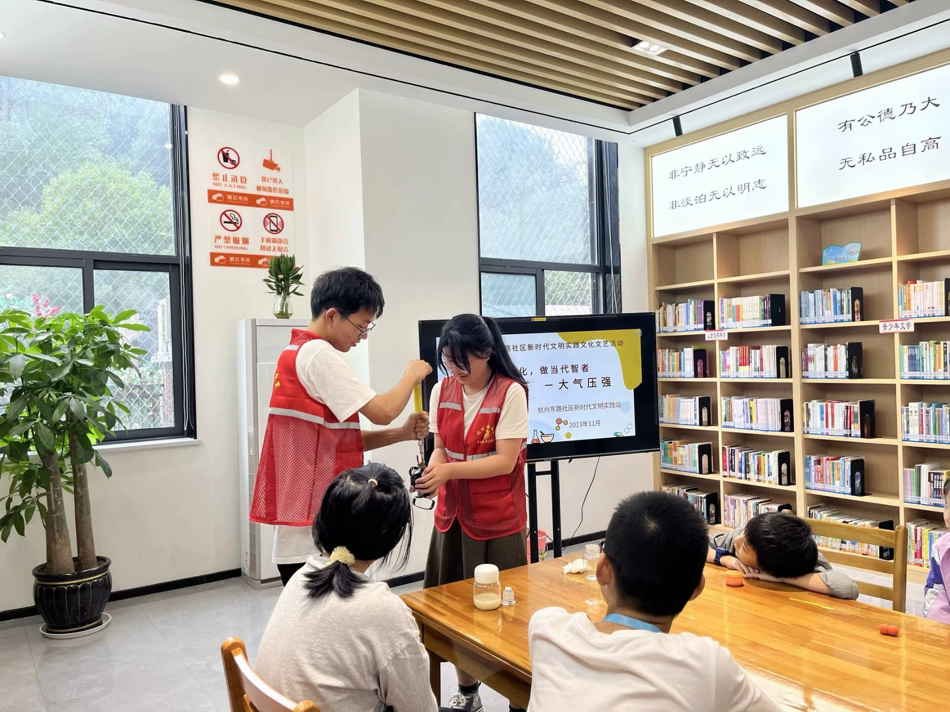 活动开始前,参与本次活动成员积极准备,结合当前学科教学特点及时代要求确定选题——大气压强。同时加强与社区的沟通,了解实情,结合实情准备本次科普讲解的课题。活动开始后,活动现场热情高涨。首先,志愿者田若含通过橡皮泥引出气体分子的概念,以及吸盘的现象让现场小朋友们更加直观地认识到大气压的概念。然后,通过“在一杯水上盖一张纸,再将杯子倒过来,杯中的水不会落下”的实验以及简易版马德堡半球实验从不同方面展示出大气压的作用,从而引出托里拆利实验及大气压相关单位概念,现场小朋友兴趣高涨,主动参与实验操作并对实验现象提出自己的想法和文体。活动最后,通过瓶吞蛋的趣味实验展示出了大气压强的影响因素等相关知识点,简单有趣的实验也会引导青少年在活动后自主探索研究,培养其探索精神和动手能力。