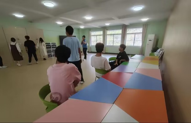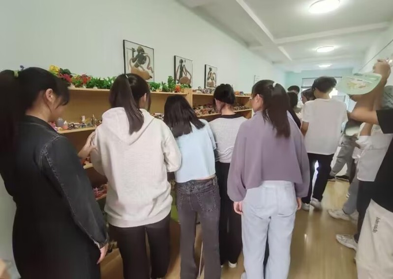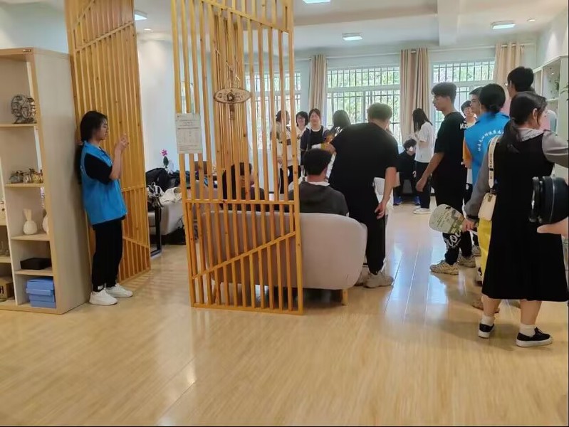志愿者们带领学生参观沙盘室、减压室和心理咨询室,并介绍它们的功能和作用。