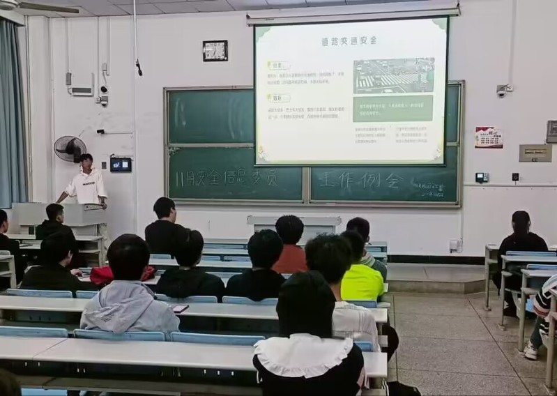 会议伊始,学院校园安全部副部长潘立晨提醒各班安全信息委员要以身作责,认真聆听本次工作例会的内容。随后,他从校内课间安全、道路交通安全、消防用电安全、防溺水安全、防范网络诈骗、饮食安全这六个方面进行了安全知识普及。