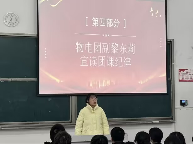团总支学生副书记黎东莉宣读团课纪律,她强调全体学员应严格遵守团课的各项规章制度,认真学习团课知识,严格规范自身行为,端正自身思想,以一名团员的身份要求自己,锻炼自己,磨砺自身意志。