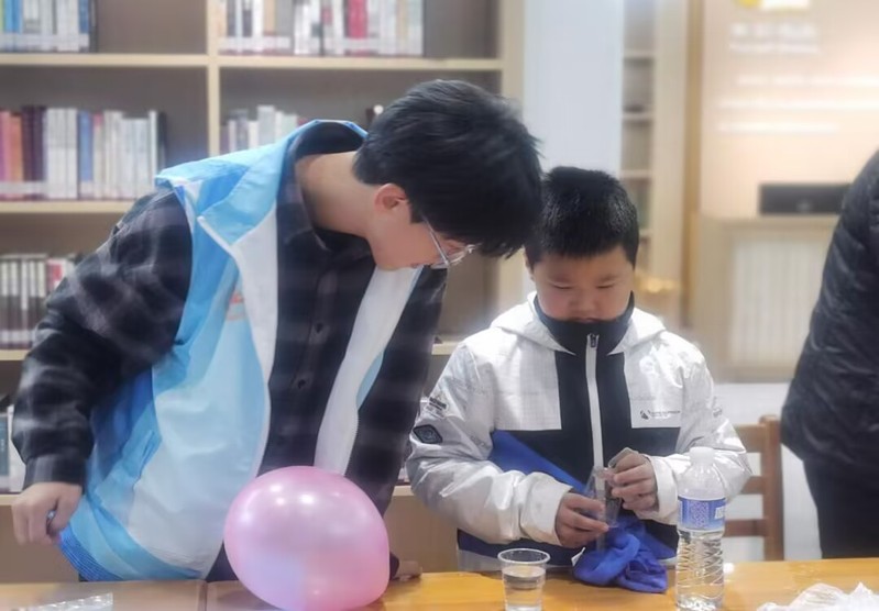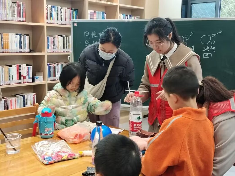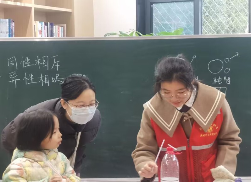 活动开展中,活动现场热情高涨。首先,志愿者高一未通过平时大家脱毛衣引出静电现象的概念,以及气球吸在黑板上的现象让现场小朋友们更加直观地认识到静电现象的概念。然后,通过“将两根吸管用毛巾摩擦,然后将其中一根放在瓶盖上,用另一根靠近,吸管转动起来”的实验以及气球拐水与静电章鱼实验从不同方面使学生们理解静电现象,现场小朋友兴趣高涨,主动参与实验操作并对实验现象提出自己的想法和问题。最后,通过科普静电在生活中的应用及危害展示出了静电现象的影响因素等相关知识点,简单有趣的实验也会激发青少年对科学的喜爱,鼓励他们探索科学的奥秘。
