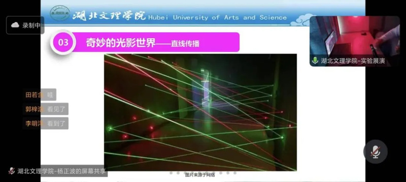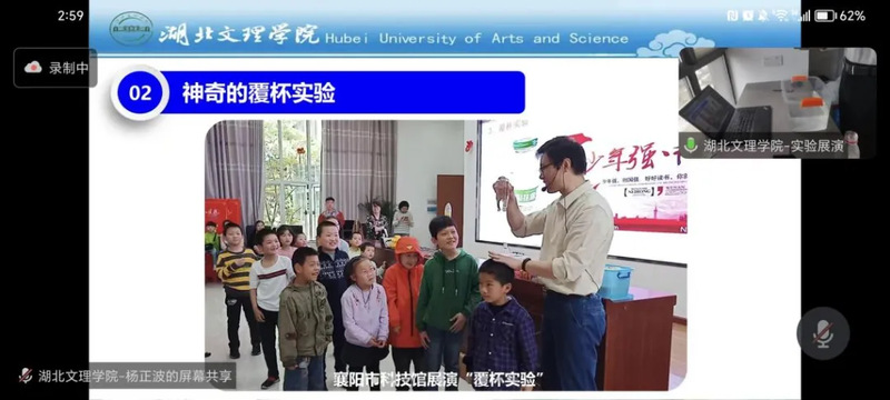 在此次寒假支教活动中,“青青萌芽”实践队与“寻物之理”科普社展开合作,于1月30下午,共同邀请了湖北文理学院的杨正波教授,为梧塘小学的孩子们带来了一场别开生面的线上物理科普实验秀。