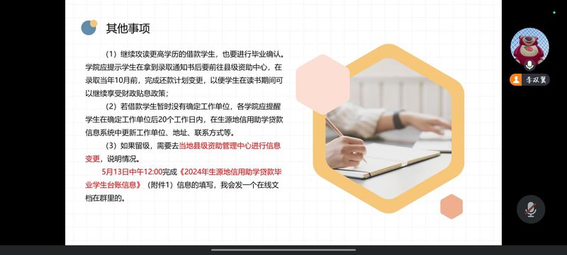 为了加强毕业生对国家助学贷款还款政策的理解,使学生了解征信体系及还贷相关知识,树立诚信还贷意识,4月29日中午,太阳集团tyc33455召开“感恩助学,诚信还款”毕业生诚信还款知识线上讲座。辅导员李双翼主讲,2020级本科及2021级研究生助学贷款毕业生参加。