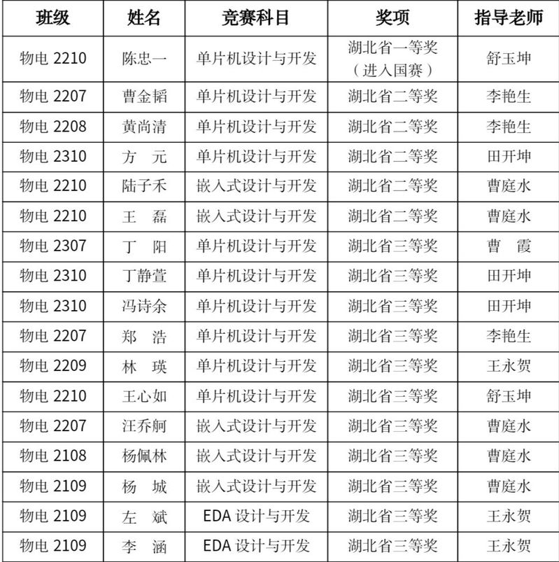经过同学们的坚持与努力,在单片机设计与开发、嵌入式设计与开发和EDA设计与开发方向与省内的武汉大学、华中科技大学等高校的学生同台竞技,最终迎来可喜成果。