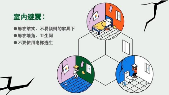 1.在家中,就近躲在结实、不易倾倒的家具下面,不要使用电梯逃生。
