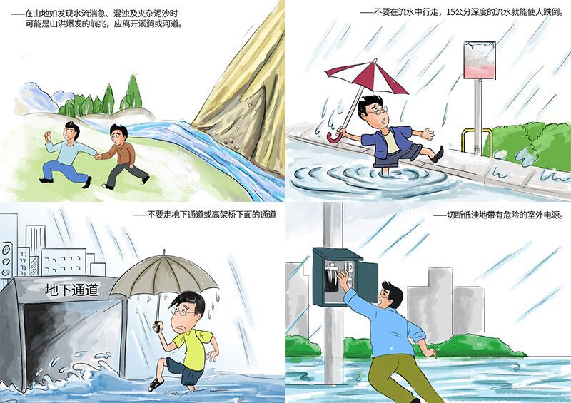 3.不要走地下通道,不要在流水中行走,远离积水路段,注意躲避下水井盖。