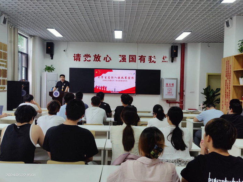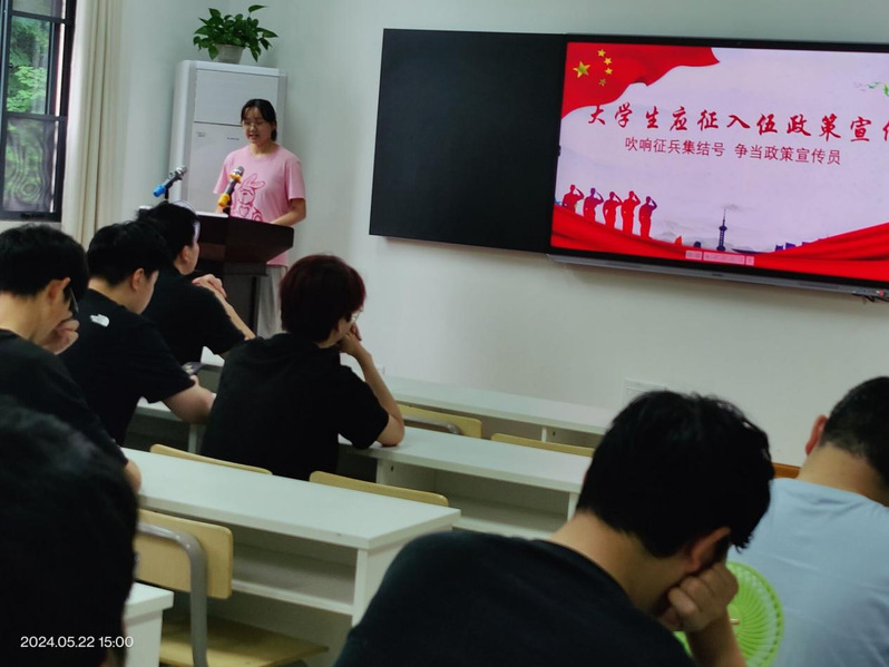 为弘扬爱国主义精神,激发广大适龄青年的参军报国热情。5月22日下午太阳集团tyc33455于至诚一站式学生社区召开征兵政策宣讲活动。辅导员田学泽、优秀退役学生徐豪以及各年级学生代表参加,田婧主持。