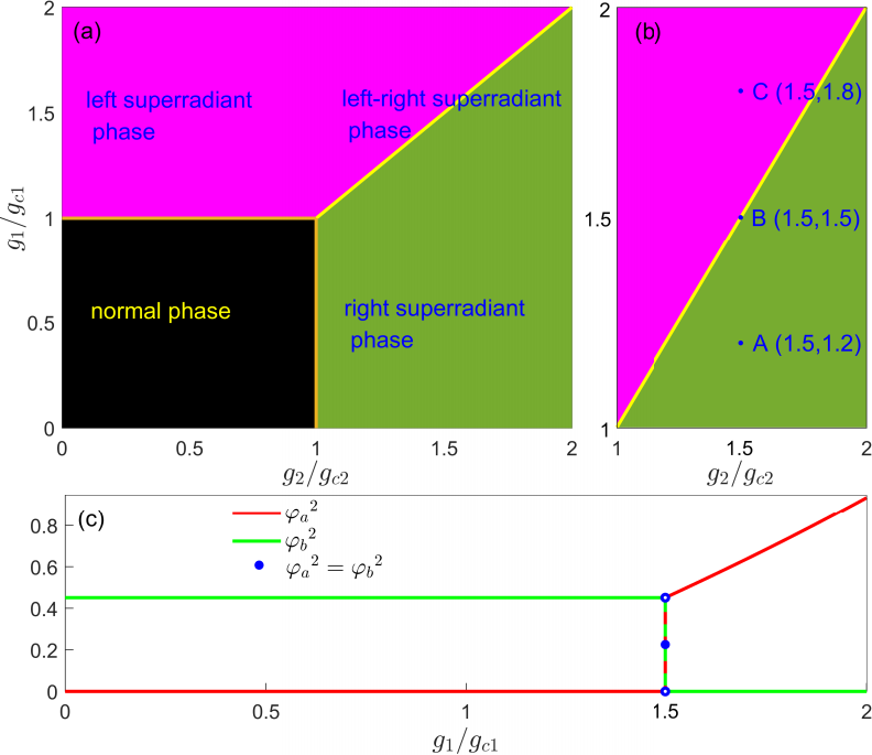 成果一:在光量子多体物理层面,超辐射相变不仅有助于光与物质的集体相互作用机制的理解,而且在量子计算、量子传感和量子精密测量中有着重要的应用。因此,探索新奇的超辐射相变行为在量子物理和量子信息技术中具有基础的重要性。通过构造一个可调控的V-型Dicke模型,论文作者发现了一个伴随全局对称破缺的新奇超辐射相变,并揭示该新型超辐射相变在机制上源于两个局域超辐射相变的平衡竞争。该研究成果以“Exploring global symmetry-breaking superradiant phase via phase competition”为题发表在Optics Letters上,李海超博士为论文第一作者,太阳成集团tyc33455cc为第一单位。
