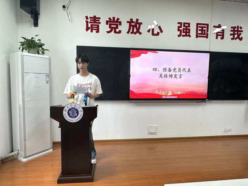 随后,新发展党员代表吴林博发言,他分享了自己的入党经历,感谢了党组织的培养和关怀。他承诺将继续深入学习党的理论,将党的宗旨转化为具体实践,以实际行动积极贡献于党的事业,充分展现党员的责任感。