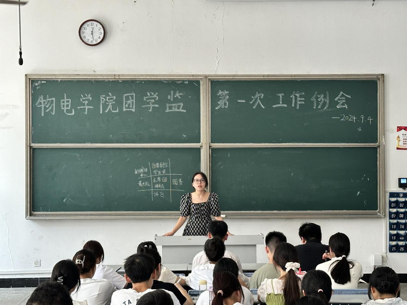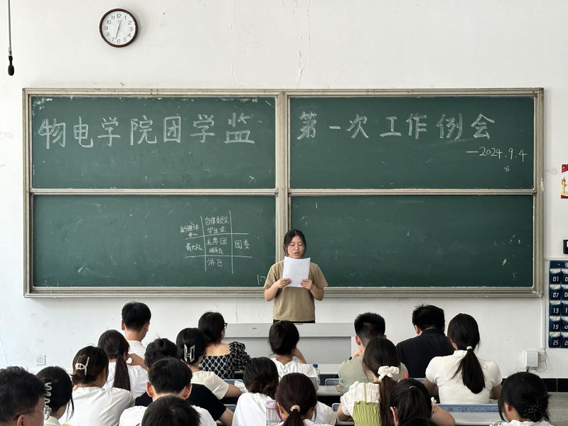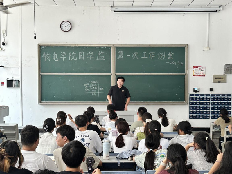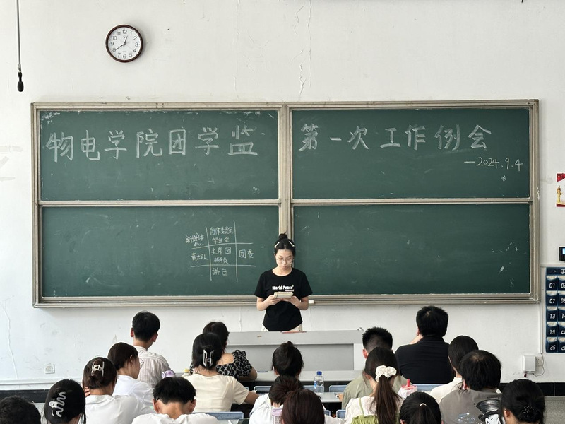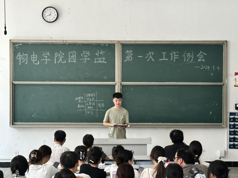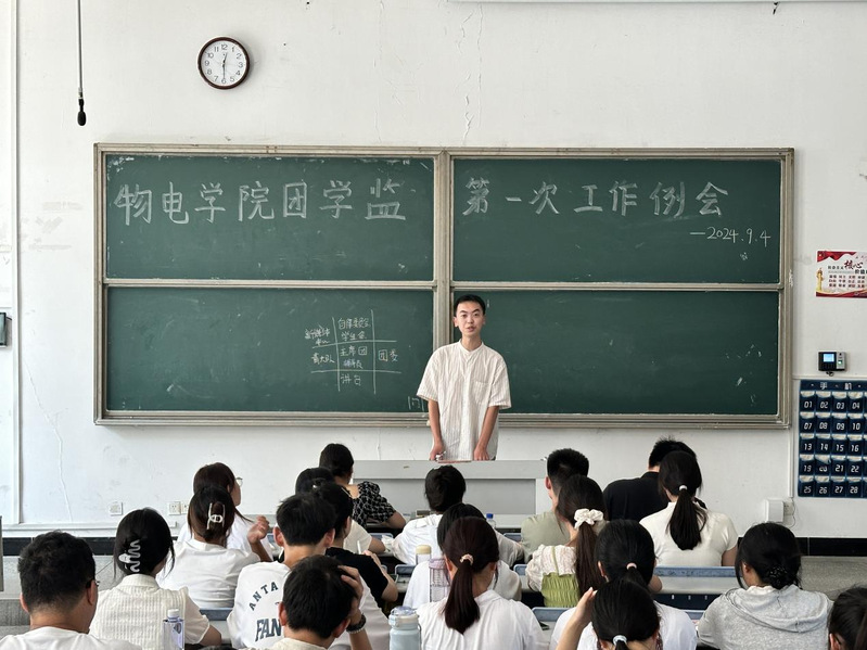 为了加强团学干部队伍建设,确保新学期工作有序开展,物电学院于9月4日中午在科技大楼9102教室召开了新学期的第一次团学工作例会。辅导员田学泽、李双翼、仇奥以及全体学生干部参加,会议由学院团委组织部副部长刘婷主持。