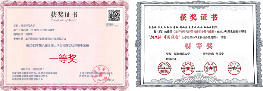 在2022年第八届全国大学生物理实验竞赛中,荣获全国一等奖。在2023年获得十四届“挑战杯·中国银行”大学生课外学术科技作品竞赛中,荣获特等奖。
