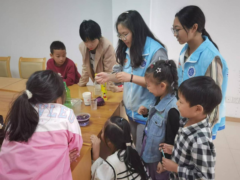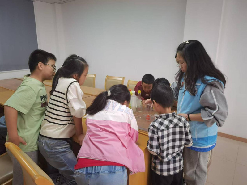 在师院社区的科普小课堂中,科普志愿者带领孩子们进行了两个实验活动。首先,志愿者利用紫甘蓝汁,指导孩子们制作了一种酸碱指示剂,孩子们观察到,紫甘蓝汁在不同酸碱环境下会呈现出丰富的色彩变化,从而对酸碱性质有了直观的认识。随后,孩子们参与了氧气体积测量实验,志愿者通过蜡烛燃烧消耗氧气的过程,让孩子们观察到水位随着氧气减少而上升的现象,帮助他们理解了氧气在空气中的比例及其重要性。这些生动的实验让孩子们在实践中学习科学,激发了他们的好奇心和探索精神。