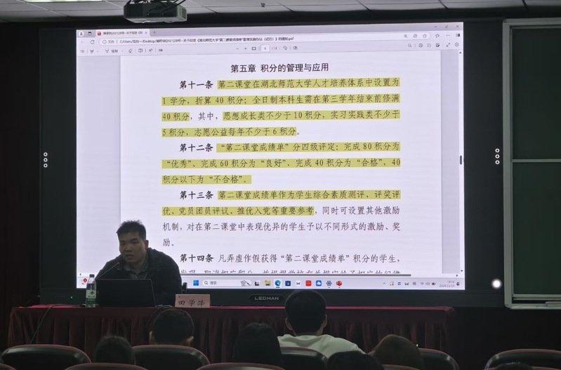 会议伊始,田学泽带领各位寝室长学习第二课堂相应积分的管理和应用,他提到全日制本科生需在第三学年结束前修满40积分,重点强调第二课堂成绩单是学生综合素质测评、评奖评优、党员团员评议、推优入党等的重要参考。