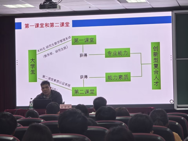接着,田学泽对第一课堂与第二课堂展开分析比较,以便各位同学清晰了解两者区别。第一课堂是教务部与研究生院认证学生是否具备专业能力的准则,而第二课堂则是团委认证学生是否具备能力素质的准则,学校将通过第一、第二课堂筛选创新型复合人才。随后,他向同学们阐述了第二课堂积分所涵盖的六个类别,分别为思想成长类、创新创业类、实践学习与志愿公益类、文艺体育类、工作履历类及技能特长类。
