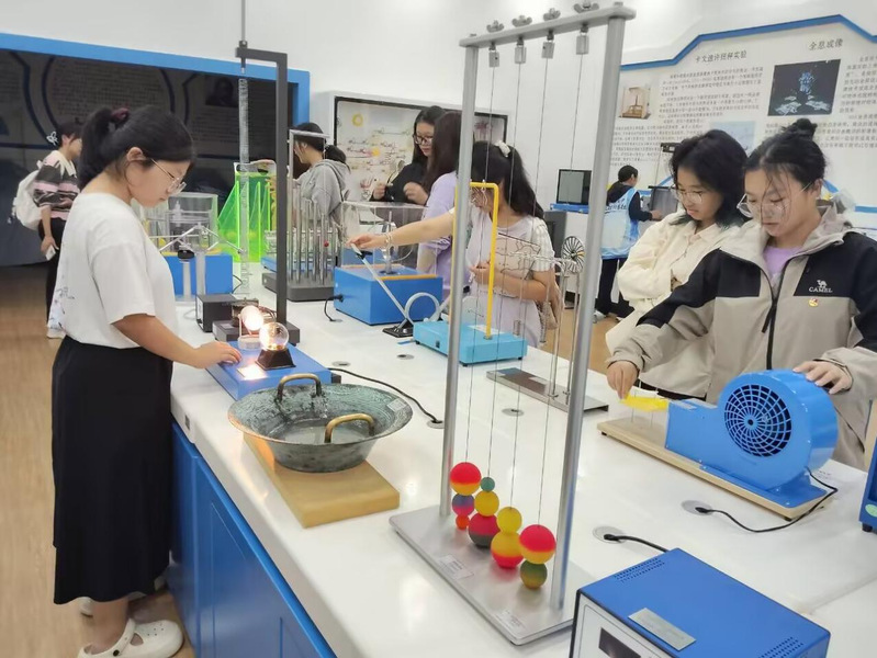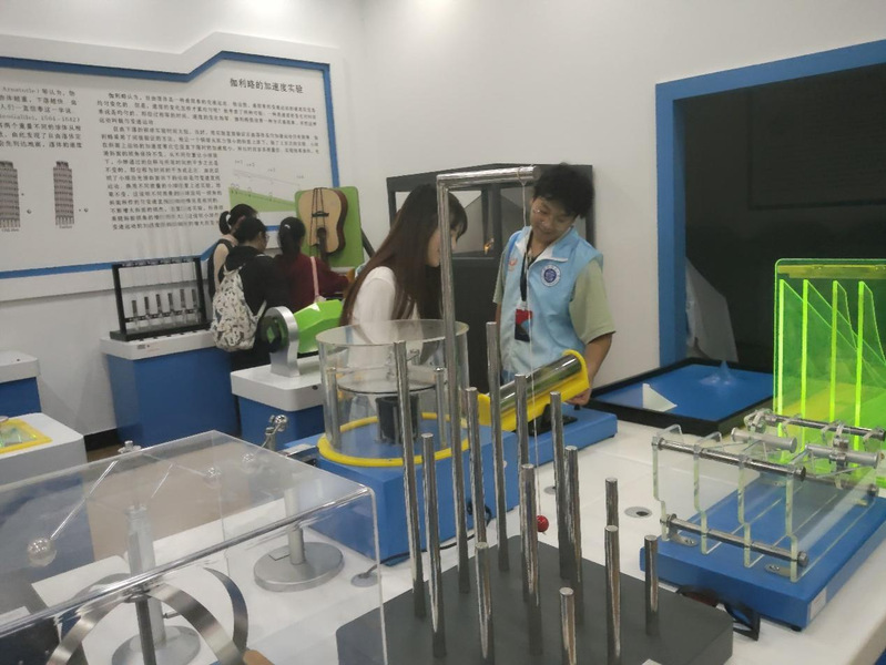 活动过程中,讲解员们带领同学们参观科普基地各个展区,讲解了各种实验仪器和相关原理,让同学们收获满满。讲解员们各展其能,或亲自演示科学实验,让同学们亲眼目睹“用手摩擦鱼洗产生共振”的奇妙现象;或在讲解过程中设置问答环节,引导同学们积极思考“锥体往上滚”的物理原理。讲解员们饱含对科普工作的热爱,为同学们开启了一扇扇科学知识的大门。