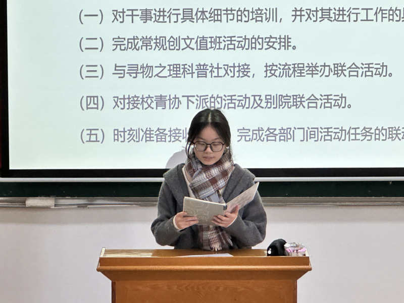 最后,团委学生副书记李佳乐针对未来的工作方向,提出三点建议。一是要善于发现问题,主动寻求改进方法,确保每项活动都能兼顾影响力与实效性;二是要强化团队协作精神,各部门要加强沟通与配合,形成工作合力,不断提升执行效率;三是要以自身行动树立榜样,真正做到以服务为基石,以责任为驱动力。
