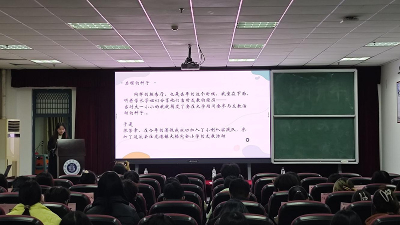 活动最后,学院三大实践队——“青青萌芽”“小喇叭”“常青藤”依次进行了风采展示。“小喇叭实践队”队员代表谢馨悦和“常青藤实践队”队员代表陈卓君分别分享了支教过程中的趣事与感悟,为现场观众带来了生动的实践体验。