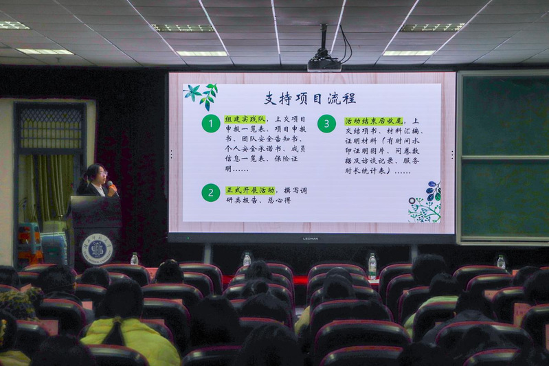 紧接着,学院团委实践部副部长梁羽婷详细介绍了2025年寒假社会实践的具体安排,包括实践课程学分要求、重点项目、支持项目以及“返家乡”社会实践等内容。在提问环节,她认真解答了同学们的疑问,并呼吁大家积极参与到社会实践活动中。