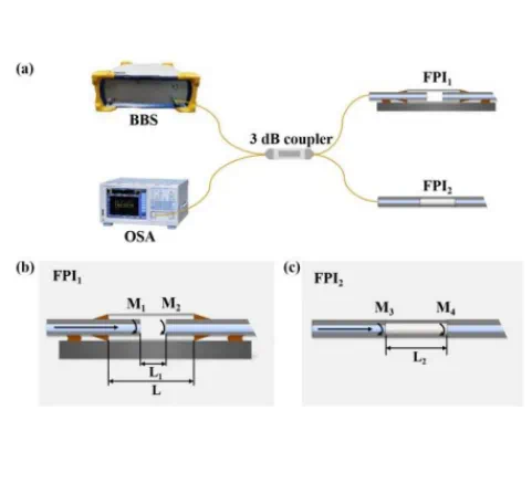 成果二:提出并且实验验证了一种基于并联法布里-珀罗干涉仪(FPI)的高灵敏度矢量磁效应(MF)传感器。首先,将两个标准单模纤维插入毛细管中构成一个悬臂梁结构的FPI1。FPI1实现了15.0 pm/µε的高轴向应变灵敏度。然后,FPI1与磁致伸缩材料Terfenol-D结合在一起,其MF强度和方向的灵敏度分别达到91.43 pm/mT和-12.75 pm/°。最后,将参考干涉仪FPI2与FPI1匹配构成谐波游标效应传感器S1。S1的MF强度和方向灵敏度分别达到-4.308 nm/mT和892.3 pm/°,将FPI1的MF强度和方向灵敏度分别提高了47倍和33倍。提出的传感器能够高灵敏度地测量MF强度和方向。此外,传感器在制造过程中只涉及光纤切割、拼接和冷粘合,而不会损坏光纤的结构。因此,它易于制造,可重复性高,成本效益高,结构坚固,易于操作。它是矢量MF传感器在实际应用中的优选之一。研究成果2024年12月发表在Optics Express上,我院青年教师晏天琦为论文第一作者,江超教授为通讯作者,太阳成集团tyc33455cc为唯一通讯作者单位。