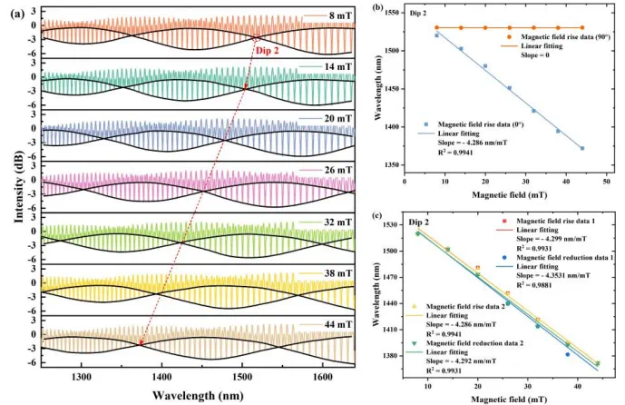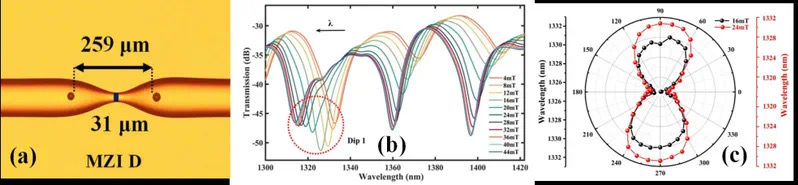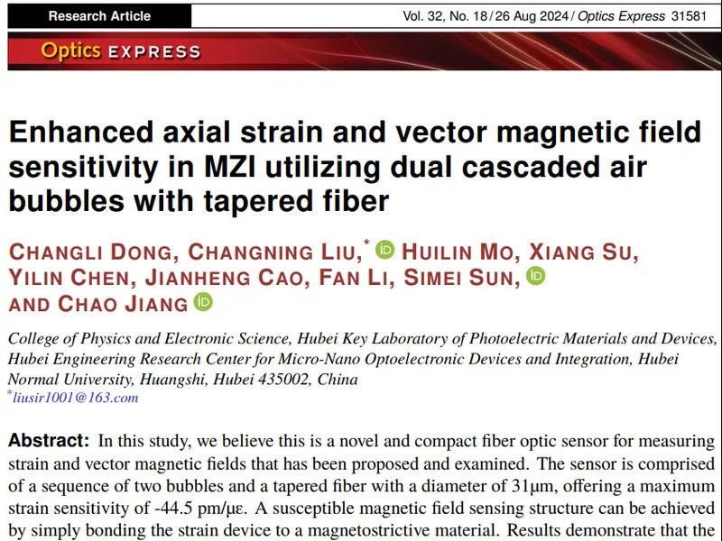 成果三:优雅的双气泡级联锥形结构是一种高灵敏度的光纤应变和矢量磁场传感器。其应变灵敏度为 -44.5 pm/με,锥形光纤直径为31μm。当粘合到磁致伸缩材料上时,传感器的最大磁场灵敏度为 -0.7838 nm/mT,在8 mT 至 28 mT范围内的线性拟合度为 0.9931。在 16 mT 和 24 mT 时,方向灵敏度分别达到 102.15 pm/°和 230.85 pm/°。此外,该传感器的交叉敏感很低,应变与温度的交叉敏感为 0.89 με/°C,磁场与温度的交叉敏感度为 0.15 mT/°C。这种传感器具有制造简单、机械强度高的优点,是土木工程、导航、地球物理和其他工业应用领域的理想选择。该研究成果2024年8月发表在Optics Express上,我院2023级研究生董长丽为论文第一作者,团队骨干成员刘昌宁副教授为通讯作者,太阳成集团tyc33455cc为唯一通讯作者单位。