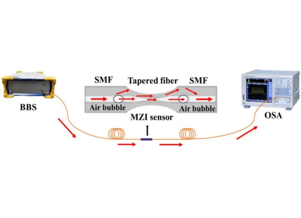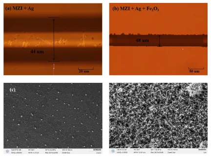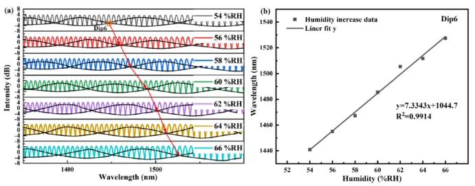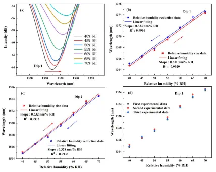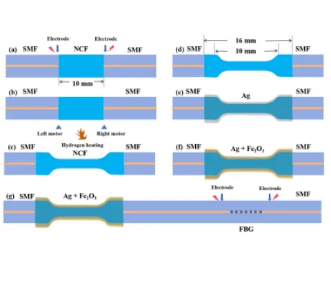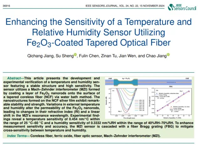 成果四:提出了一种结构稳定的高灵敏度的新型温湿度传感器。该传感器采用马赫-曾德尔干涉仪(MZI)来制备。我们首先在NCF上镀一层银膜,然后通过水浴法在锥形无芯光纤(NCF)表面涂覆一层Fe2O3纳米棒形成一种对温湿度敏感的传感器结构,该结构表现出显著的稳定性和高强度。当外部温度和湿度的变化会改变Fe2O3纳米棒的渗透性,导致其折射率(RI)变化和MZI共振波长的线性偏移。实验结果显示在25℃-60℃范围传感器的温度灵敏度达到0.454 nm/℃;在40%RH-70%RH湿度范围传感器的湿度灵敏度为0.3332 nm/%RH。为了提高测量精度,将MZI与光纤布拉格光栅(FBG)级联,以减轻温度和湿度之间的交叉灵敏度。该研究成果2024年11月发表在IEEE Sensors Journal上,我院2023级硕士研究生姜奇昌为论文第一作者,团队骨干成员盛苏教授为通讯作者,太阳成集团tyc33455cc为唯一通讯作者单位。