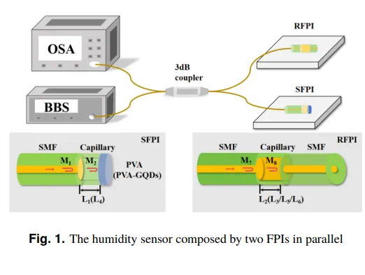成果一:提出并实验验证了一种基于聚乙烯醇(PVA)掺杂石墨烯量子点(GQD)的新型光纤法布里-珀罗干涉仪(FPI)湿度传感器。该传感器由感测FPI和参考FPI并联组成。两个传感FPI分别由湿敏材料PVA和PVA-GQD组成。实验研究发现,在PVA中掺杂GQD会使湿度敏感性提高2.1倍。通过拼接单模光纤和石英毛细管制备了四个参考FPI,将它们与两个传感FPI结合,形成两个游标效应(VE)传感器和两个谐波游标效应(HVE)传感器。实验研究发现,PVA作为VE传感器和HVE传感器的传感材料的灵敏度分别为-1.0804 nm/%RH和-1.6566 nm/%RH。PVA-GQDs作为VE传感器和HVE传感器的传感材料的灵敏度分别为3.1527 nm/%RH和7.3343 nm/%RH。此外,两个HVE传感器的温度串扰最小。PVA-GQD是一种出色的湿敏材料,显著提高了湿度传感器灵敏度,使其成为湿度传感有前景的候选者之一。该研究成果于2024年8月发表在Optics Express上,我院2023级硕士研究生郭子豪为论文第一作者,江超教授为通讯作者,太阳成集团tyc33455cc为唯一通讯作者单位。