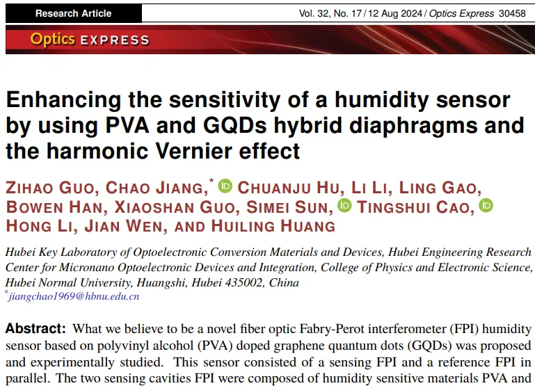 论文信息:郭子豪, 江超*, 胡传菊, 李丽, 韩博文, 郭小珊, 孙四梅, 曹庭水, 李宏, 温建,黄会玲. Enhancing the sensitivity of a humidity sensor by using PVA and GQDs hybrid diaphragms and the harmonic Vernier effect, Optics Express, vol. 32, no. 17, Aug. 2024, 30458-30480.