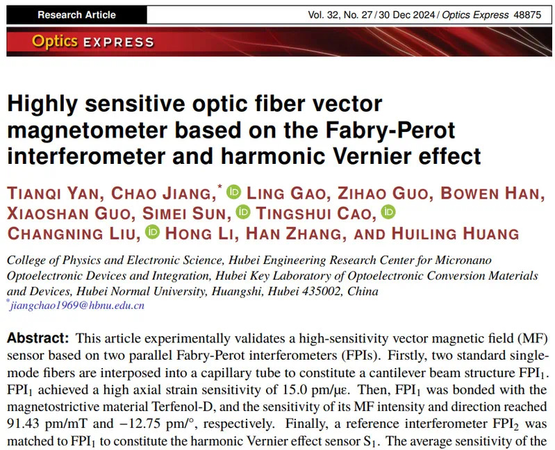 论文信息:晏天琦, 江超*, 高岭, 郭子豪, 韩博文, 郭小珊, 孙四梅, 曹庭水, 刘昌宁, 李宏, 张晗, 黄会玲,Highly sensitive optic fiber vector magnetometer based on the Fabry-Perot interferometer and harmonic Vernier effect, Optics Express 2024, 32(27): 48875-48894.