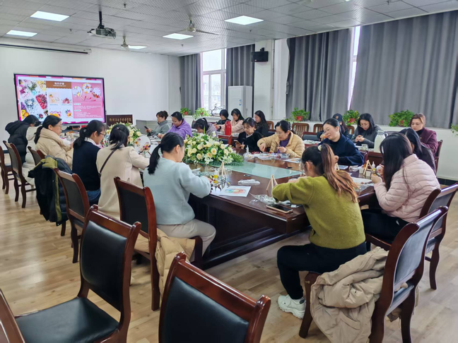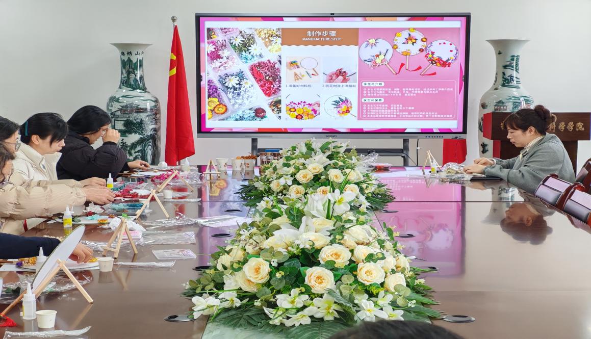 活动伊始,即为充满浪漫与创意的永生花团扇手工DIY环节。女教职工们充分发挥奇思妙想,将色彩缤纷的永生花精心布局在团扇之上。小小的团扇,不仅封存了花朵的芬芳,更承载着她们对美好生活的向往,也为活动营造出优雅温馨的氛围 。