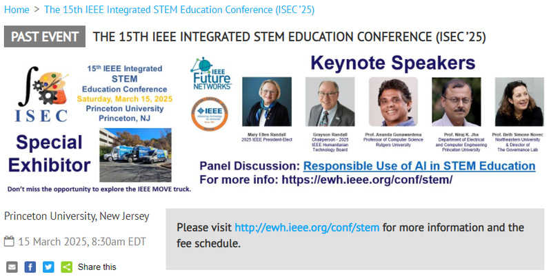 IEEE ISEC'25(IEEE Integrated STEM Education Conference)于2025年3月15日在美国新泽西州举行,是IEEE旗下专注于STEM 教育综合方法的重要会议,是国际工程教育领域中展示和研讨 STEM 教育综合方法、前沿研究与实践经验的权威平台。