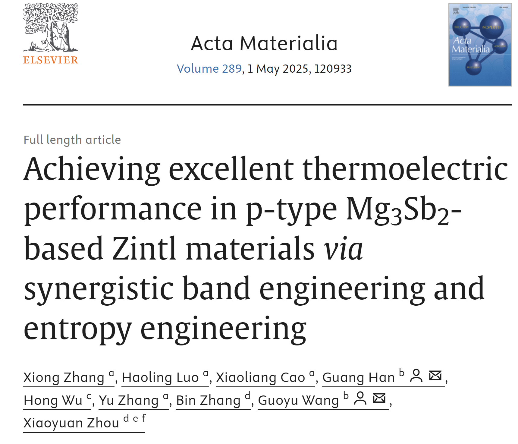 论文信息:Xiong Zhang, Haoling Luo, Xiaoliang Cao, Guang Han, Hong Wu, Yu Zhang, Bin Zhang, Guoyu Wang, Xiaoyuan Zhou, Achieving excellent thermoelectric performance in p-type Mg3Sb2-based Zintl materials via synergistic band engineering and entropy engineering, Acta Materialia, 2025, 289, 120933。