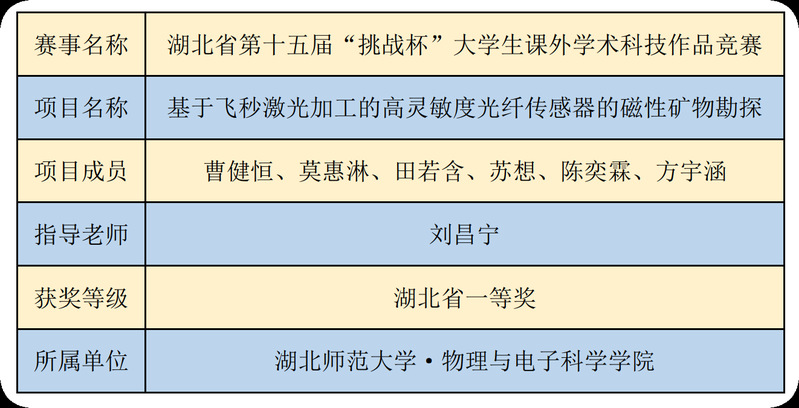 我院物理学专业本科生团队获得湖北省一等奖,该团队得到了院领导的大力支持,所有实验均依托于我院的两个高水平科研平台——光电转换材料与器件湖北省重点实验室、微纳光电器件与集成湖北省工程研究中心。该团队致力于光电子器件领域的前沿工作,结合光纤传感与飞秒激光加工技术,制备了一系列灵敏度高,结构简洁优雅,性能优良的光纤传感器,对促进我国工业的发展有潜在的应用价值。