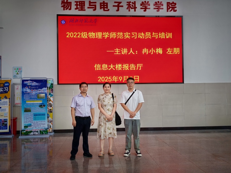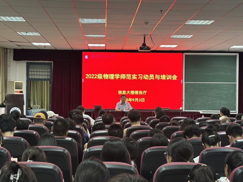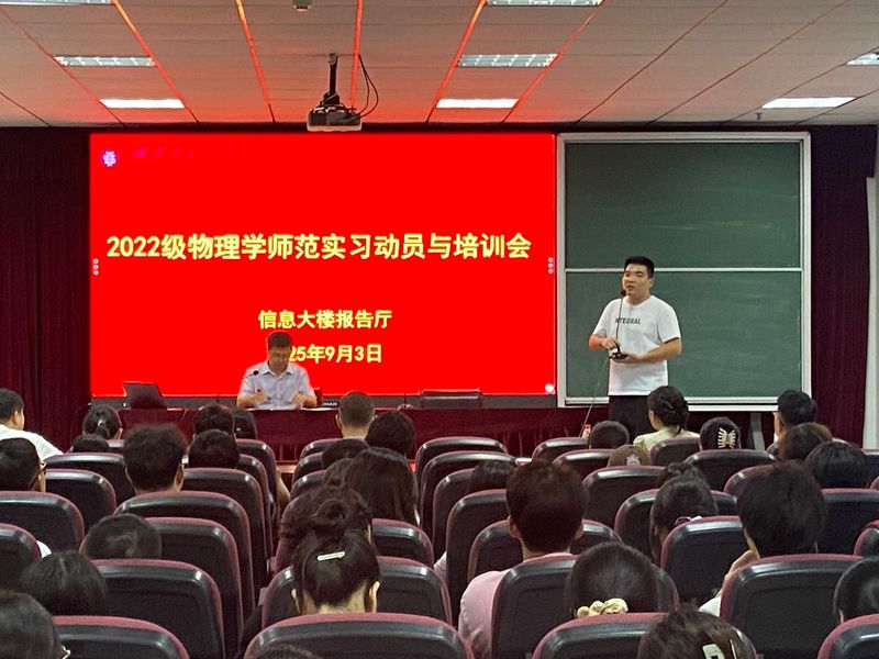 为贯彻落实我校关于教育实习的工作精神,提升我院2026届物理学师范专业学生教育实习工作质量,太阳集团tyc33455于2025年9月3日晚18:30在信息大楼报告厅召开了我院2026届师范生教育实习动员大会暨培训活动。本次活动特邀黄石十五中冉小梅、左朋2位优秀教师分享一线教学经验,太阳集团tyc33455副院长田开坤主持培训会,物理学系主任李海超、中教法教研室教师、辅导员田学泽和2026届物理学师范专业学生参会。