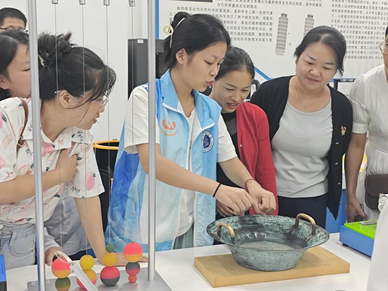 紧接着,充满古韵的“鱼洗盆实验”点燃全场热情。讲解员双手摩擦青铜盆双耳,盆内水面瞬间涟漪微动,继而水花飞溅。这一现象是由于手部摩擦产生的振动传导至盆体,与水形成了共振。古老青铜盆与现代科学的精彩碰撞,让国培学员真切感受到传统器物中的科学底蕴,也为初中化学“振动与波”相关内容的教学,提供了可借鉴的鲜活案例。