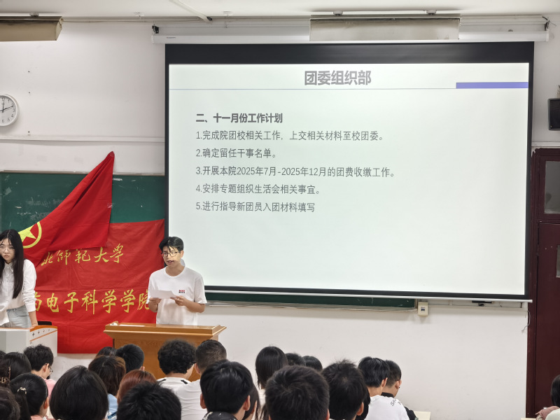 为统筹推进学院团学工作,明确学期任务重点,凝聚团学组织力量,10月16日中午,太阳集团tyc33455于教育大楼1J12教室召开十月团委工作例会。院团委学生副书记陈卓君、梁羽婷,青大队主席熊欣、吴烨,新媒体中心主席张祖荣、余奕樊,全体团委学生干部、25级各班团支书及青小队长参会。会议由团委组织部副部长周馨媛主持。