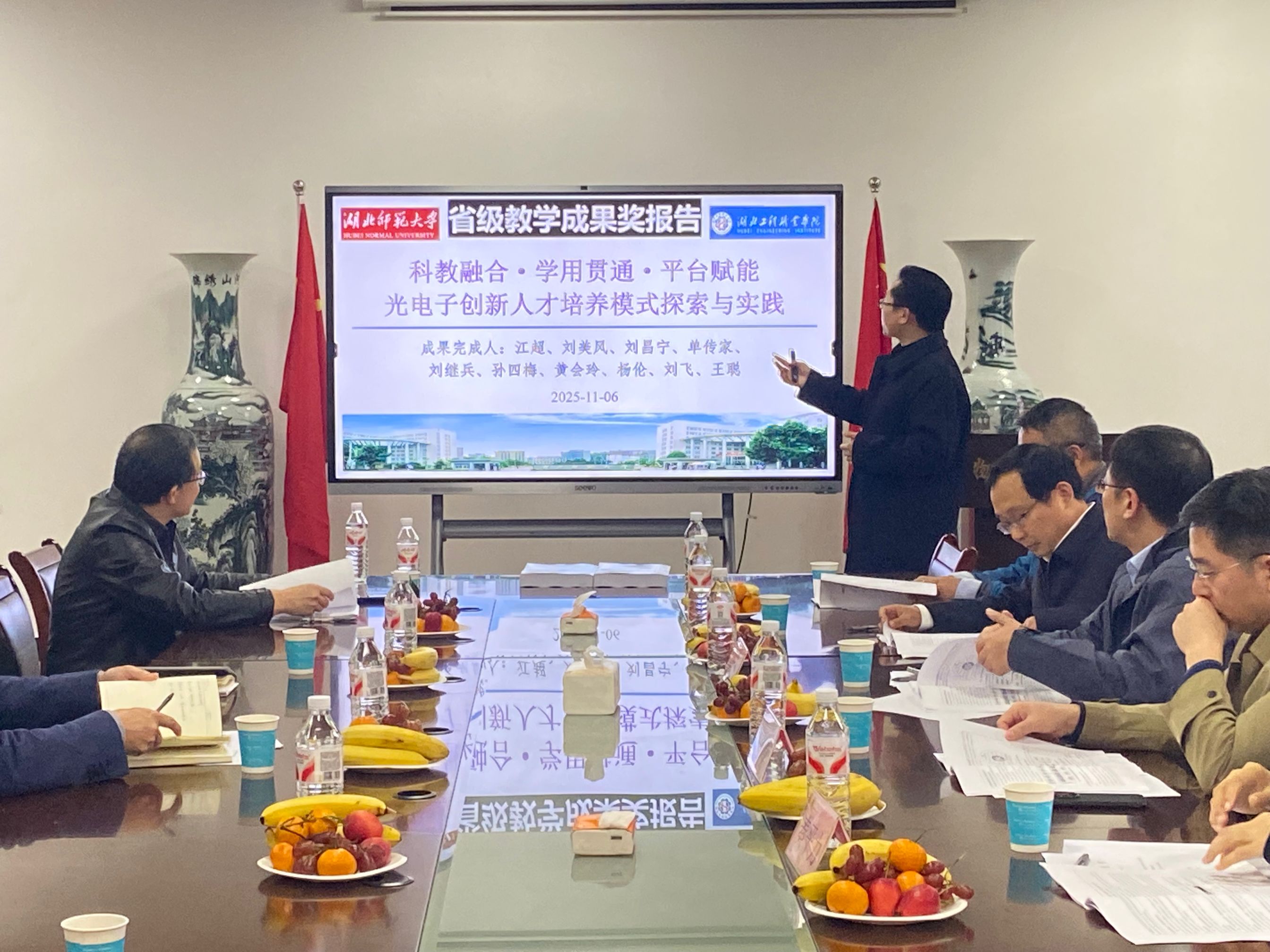 参加成果鉴定的专家有华中科技大学武汉光电国家研究中心党委书记张敏明教授、中南民族大学电子信息工程学院院长杨春勇教授、武汉工程大学光电信息与能源工程学院副院长秦平力教授、湖北工业大学芯片产业学院徐鹏教授和湖北理工学院电气与电子信息工程学院院长章磊教授,我院参加本次鉴定会的有成果建设团队核心成员江超教授,刘昌宁副教授,孙四梅副教授,黄会玲老师。参会还有学院党委书记孙丹娟、副院长田开坤。