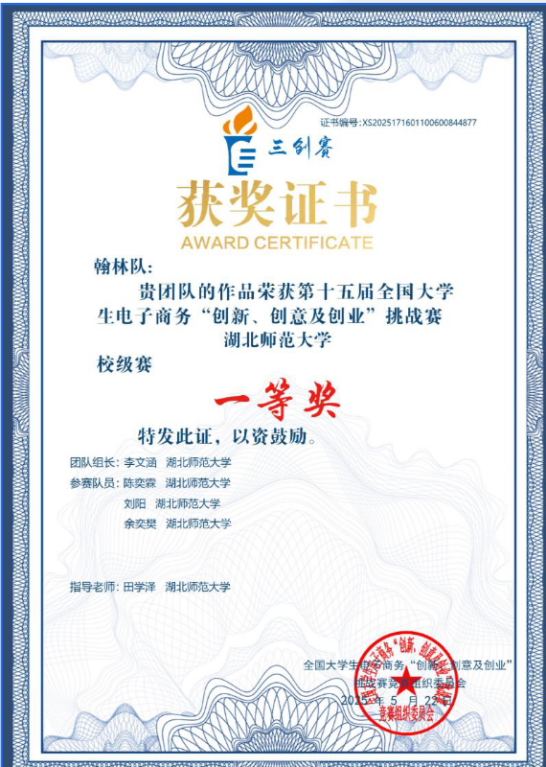 11、2025年5月,第15届全国大学生电子商务“创新,创意及创业”挑战赛 太阳成集团tyc33455cc校级赛;一等奖