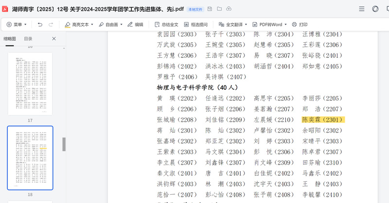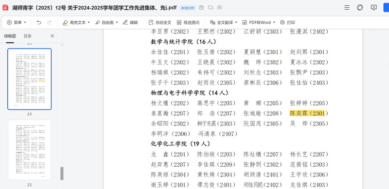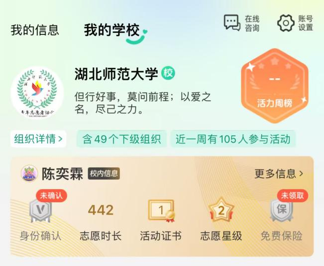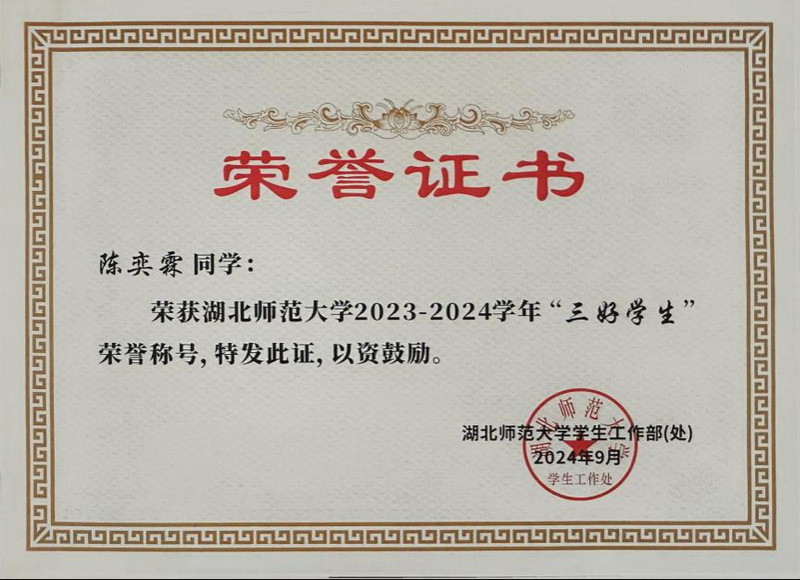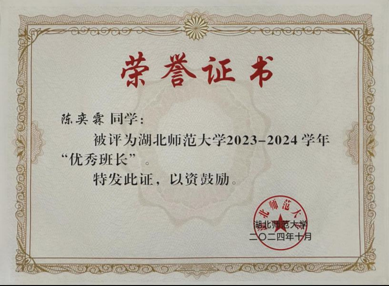 作为湖师学子,她以“知行合一、奉献社会”为行动标尺,在实践服务与荣誉积淀中绘就青春底色。她累计志愿服务时长442小时,获评校级“优秀青年志愿者”,用持续奉献诠释责任担当;深度参与“青青萌芽”实践队开展乡村科普支教,团队获“湖北日报”“云上阳新”等媒体报道,2025年暑期开展社会调研问卷工作,为区域发展提供数据支撑,将专业所学转化为服务社会的实际动能。个人成长维度,她斩获“优秀班长”“三好学生”“优秀学生干部”“军训标兵”等称号,连续两年摘得校级“综合一等奖学金”,所在寝室荣获“校级内务优秀寝室”“文明宿舍”集体荣誉,在服务他人与自我提升的双向进阶中,书写出全面发展的青春答卷。