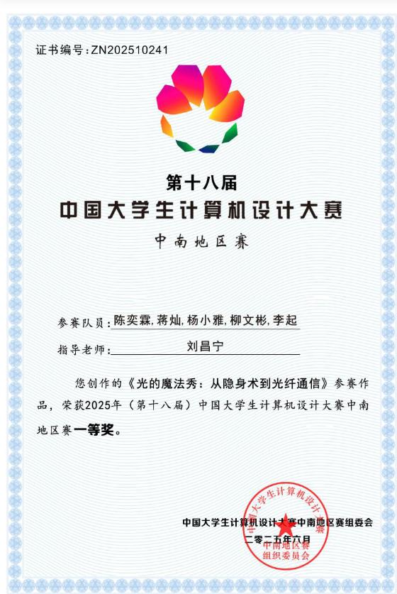 陈奕霖以“科研筑梦、竞赛砺能”为信念,在学术与竞技赛道上双向突破。她聚焦光电传感领域学术研究,参与发表《Enhanced axial strain and vector magnetic field sensitivity in MZI》等 4 篇国家级期刊论文,涉及光纤轴向应变与矢量磁场传感、气液温压传感等前沿方向,为光电技术创新提供理论支撑。科研实践中,深度参与 3 项科研立项:其中,国家级大学生创新创业训练计划项目“基于磁致伸缩材料的高灵敏度光纤传感器的研究”优秀结项,省级项目“便携式‘日记’仪”顺利结项,还参与太阳成集团tyc33455cc校级师范生教育教学研究项目,在跨领域科研协作中锤炼创新思维与团队攻坚能力。