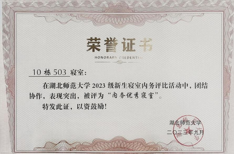 5、2023年9月太阳成集团tyc33455cc2023级新生寝室内务评比获得“校级内务优秀寝室”;