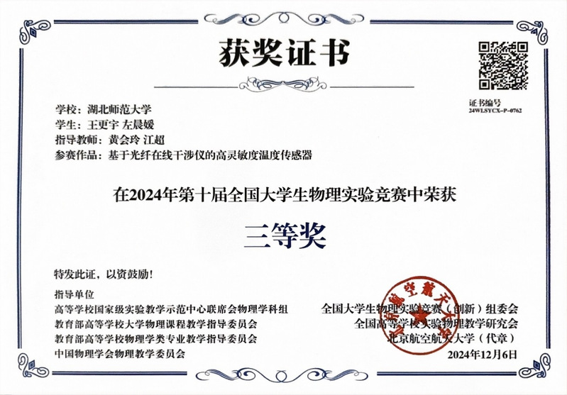 2024年12月荣获第十届全国大学生物理实验竞赛三等奖