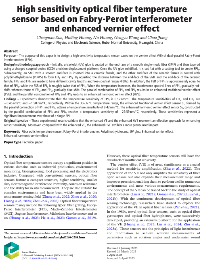左晨媛以严谨专注的态度研究光学纤维传感领域。面对温度传感技术在高精度检测场景中的需求痛点,她和团队聚焦Fabry-Perot干涉仪与增强型游标效应的创新结合,开启了为期数月的攻关之旅。从文献阅读到结构制造,从参数优化到数据验证,她反复制作结构和数据验证,最终,其以第一作者身份完成论文《High sensitivity optical fiber temperature sensor based on Fabry - Perot interferometer and enhanced vernier effect》成功发表于传感领域知名期刊 Sensor Review。该研究提出的新型传感器设计,有效提升了温度检测灵敏度与稳定性,为工业监测、生物医疗等领域的高精度温度传感应用提供了重要技术参考,也用青春的钻研与坚守,书写了学术探索路上的亮眼篇章。