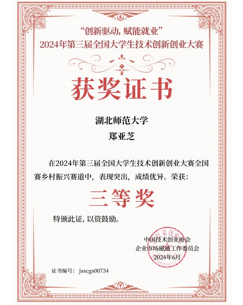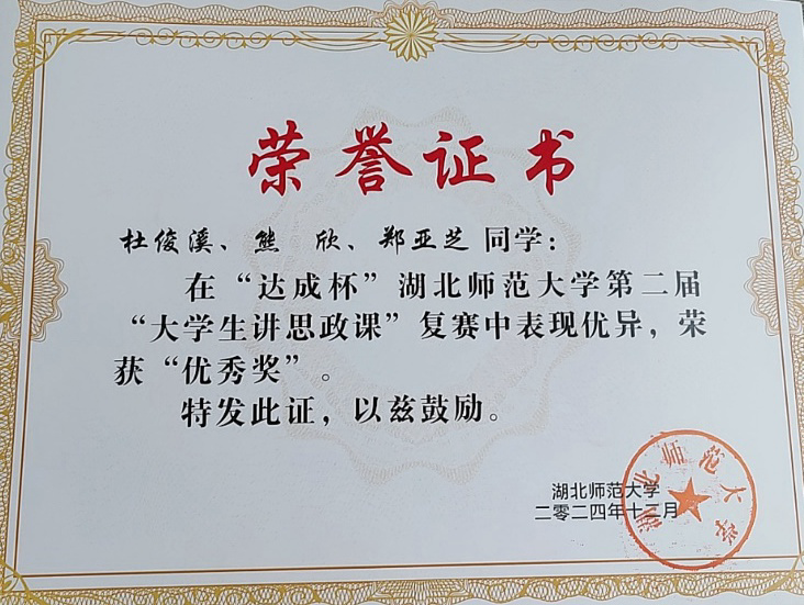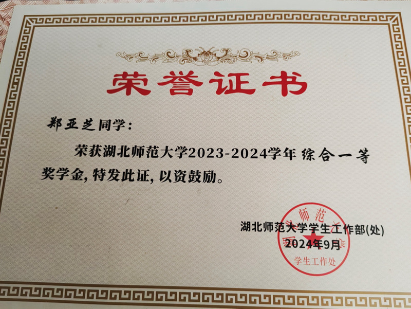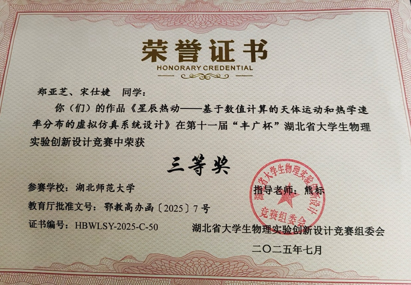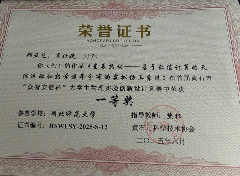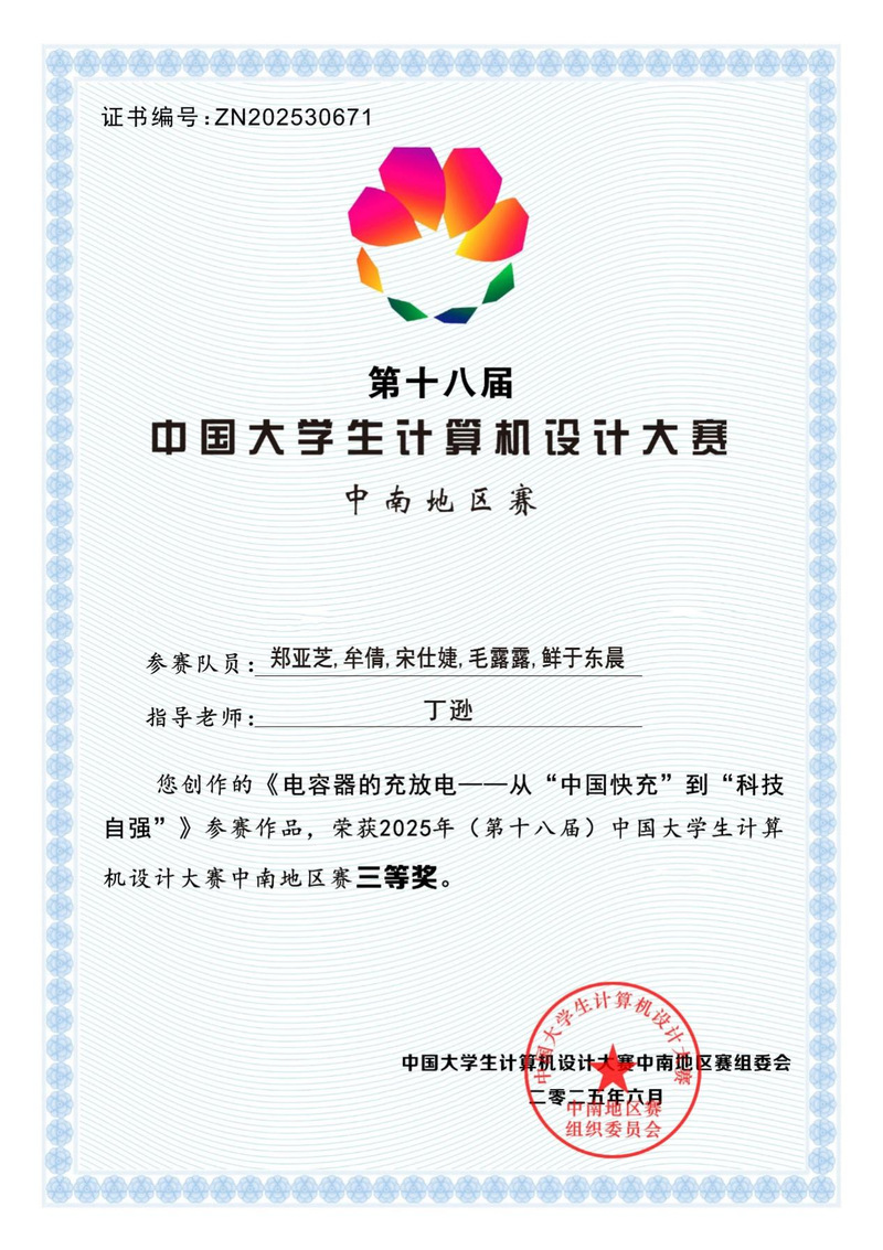 在夯实专业基础的同时,郑亚芝勇于突破舒适区,以科创为笔,在竞赛舞台上书写青春华章。她聚焦物理实验创新与技术创新创业领域,主动参与各类校级、省级、国家级赛事,从选题构思到方案设计,从实验操作到成果打磨,每一个环节都全力以赴、精益求精。面对竞赛中的难点与挑战,她不畏惧、不退缩,反复调试实验参数,优化创新方案,在一次次试错与改进中突破自我。最终,她从众多参赛者中脱颖而出,先后斩获2024年“全国大学生技术创新创业大赛”全国赛三等奖、第十一届“丰广杯”湖北省物理实验创新大赛三等奖、第十五届MathorCup挑战赛省级三等奖等多项荣誉,更连续两届在中国大学生计算机设计大赛中获省级三等奖,将物理理论与实践创新完美融合,用实力证明了“以赛促学、以赛促创”的成长力量。