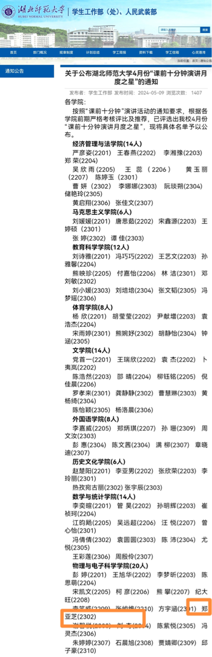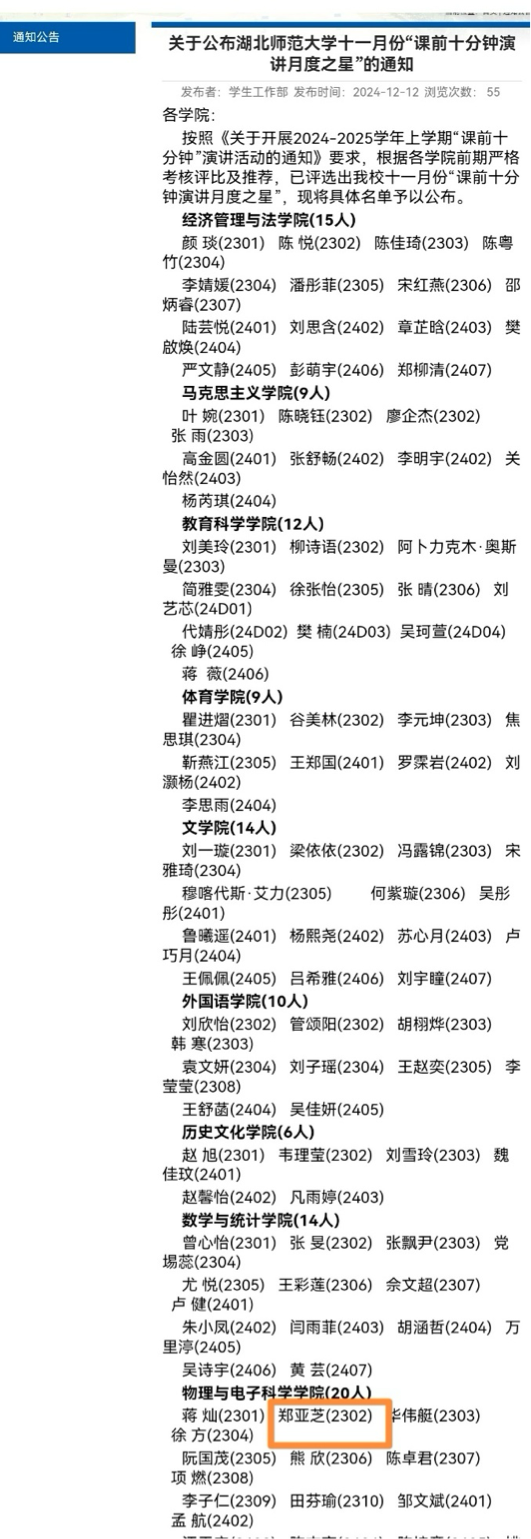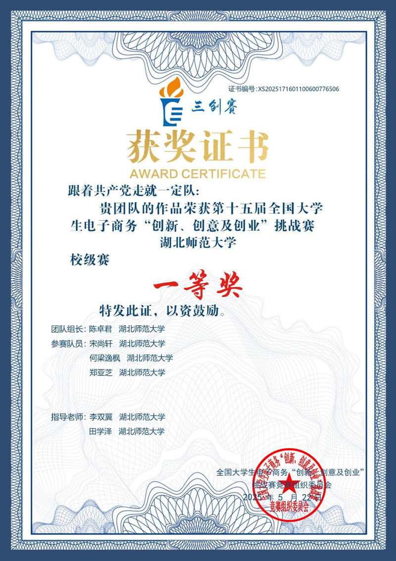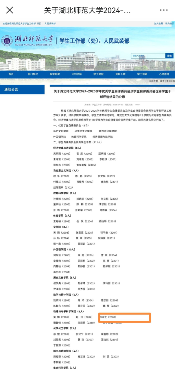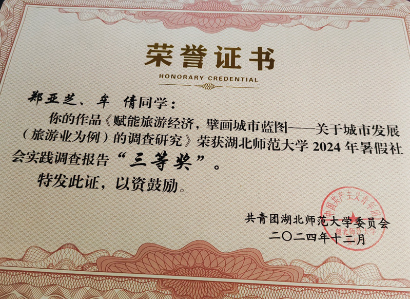 在夯实专业基础的同时,郑亚芝勇于突破舒适区,以科创为笔,在竞赛舞台上书写青春华章。她聚焦物理实验创新与技术创新创业领域,主动参与各类校级、省级、国家级赛事,从选题构思到方案设计,从实验操作到成果打磨,每一个环节都全力以赴、精益求精。面对竞赛中的难点与挑战,她不畏惧、不退缩,反复调试实验参数,优化创新方案,在一次次试错与改进中突破自我。最终,她从众多参赛者中脱颖而出,先后斩获2024年“全国大学生技术创新创业大赛”全国赛三等奖、第十一届“丰广杯”湖北省物理实验创新大赛三等奖、第十五届MathorCup挑战赛省级三等奖等多项荣誉,更连续两届在中国大学生计算机设计大赛中获省级三等奖,将物理理论与实践创新完美融合,用实力证明了“以赛促学、以赛促创”的成长力量。
