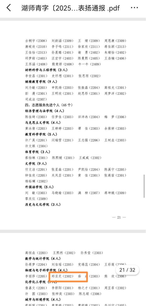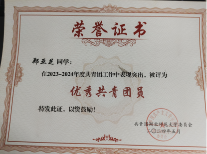 作为中共党员,郑亚芝始终牢记初心使命,将“服务他人、奉献集体”的信念融入日常行动。在学生工作中,她先后担任班级学习委员、院宿舍管理部部长、校学生会权益部负责人等职务,秉持“宽于待人,严于律己”的原则,认真对待每一项工作,耐心解决同学们的学习与生活难题,用责任心与热忱搭建起师生沟通的桥梁,多次获评“优秀学生干部”。在志愿服务与社会实践中,她积极投身各类公益活动,主动参与志愿服务,用实际行动传递温暖,先后被评为“志愿服务先进个人”“优秀志愿者”“优秀青年志愿者”,以青春之我、奋斗之我,诠释了新时代青年的责任与担当。