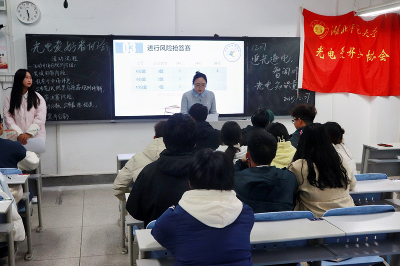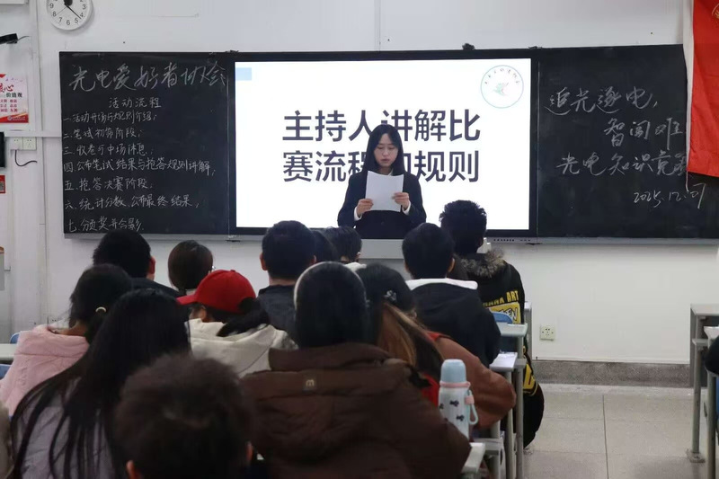 为夯实学生光电领域理论基础,锤炼科学思维与团队协作能力,12月27日,太阳集团tyc33455光电爱好者协会于教育大楼1422教室举办了“追光逐电,智闯难关”光电科学知识竞赛。光电爱好者协会会长陈奕霖、全体协会成员与多院参赛选手共同参与本次竞赛。竞赛由秘书部干事刘胜花主持。
