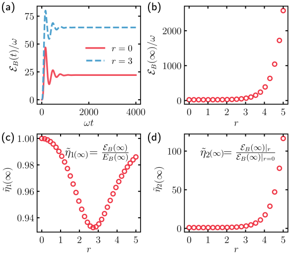 进展二:量子电池作为下一代储能器件,有望利用量子效应实现远超经典电池的存储容量和充电速度。然而,能量回流与环境退相干是制约其性能的两大关键难题。团队提出并系统研究了一种通过压缩库调控大幅提升双模量子电池性能的创新方案。其核心机制是将量子电池与压缩库耦合,有效抑制能量回流,从而显著提升储能总量和最大可提取功。理论结果表明,该方案中储能随压缩参数呈指数增长,并揭示了在库调控下,哈密顿量中常被忽视的反旋转波项对性能的积极贡献。此外,我们建立了压缩库调控策略与主动哈密顿量调控之间的物理等效性。该方案还被扩展至现实条件,包括有限温度、无外部驱动等模型,验证了其鲁棒性和通用性。研究工作为量子电池的性能优化提供了新的方法和研究视角,成果以 “Quantum battery via reservoir engineering”(基于库调控的量子电池) 为题,发表于 Physical Review Applied, 25, 034013 (2026)。论文第一作者为2024级硕士研究生杨瑾,通讯作者为量子光学与量子信息团队熊标副教授。其他作者包括2024级硕士研究生方思博、以及东北大学赵成松博士,量子光学与量子信息团队单传家教授。