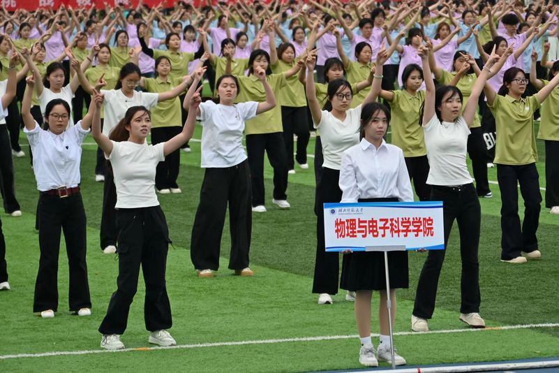 接下来是集体团体操表演。各学院学子同心携手,伴着灵动昂扬的旋律,动作整齐划一、舒展有力。活力四射的姿态、青春洋溢的笑脸,汇聚成运动场上一道靓丽壮阔的风景线。物电学子以饱满的热情、昂扬的状态融入集体,用默契的配合展现团结之力,用蓬勃活力彰显少年本色,完美诠释了湖师学子凝心聚力、携手共进的青春担当。