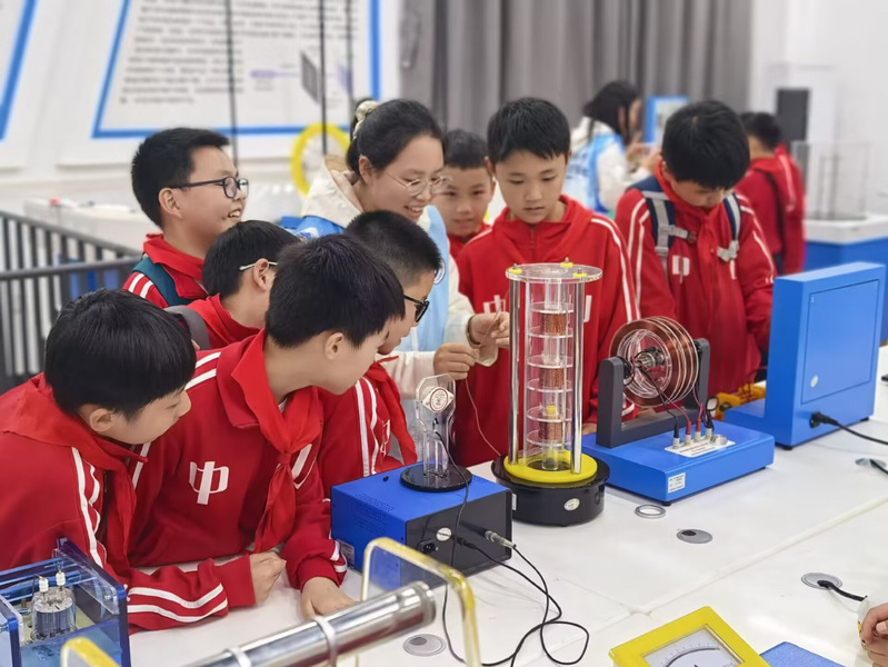 在互动体验环节,同学们亲手操作实验设备,近距离感受科学的奇妙。电流磁性、光影变化等趣味实验让学生们兴致盎然、倍感新奇。学生们边看边问,边学边记,在轻松愉快的氛围中,学习科学知识。